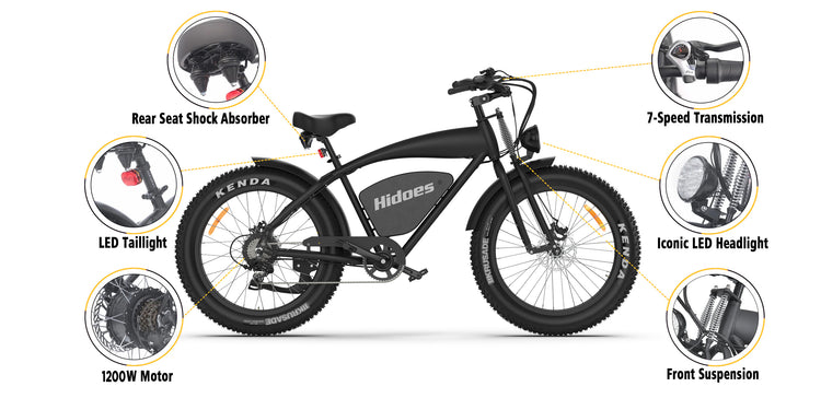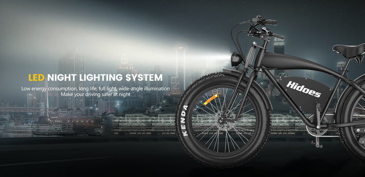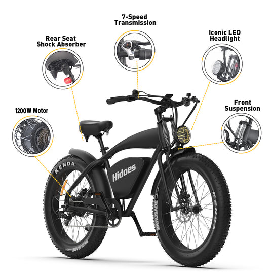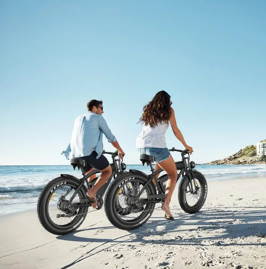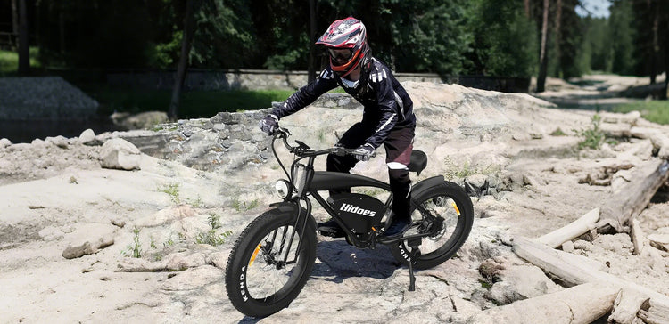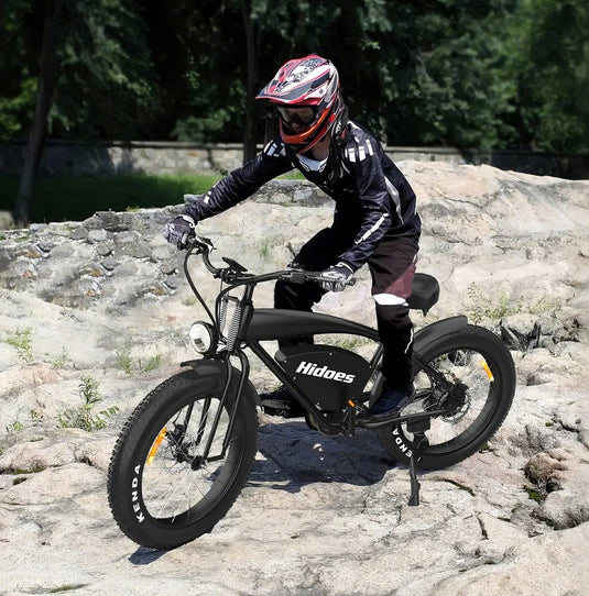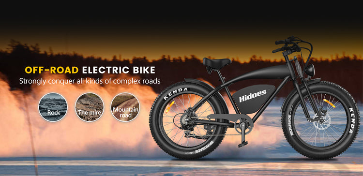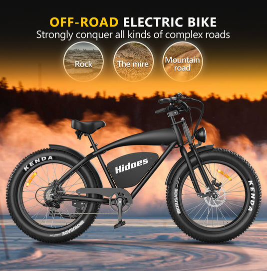 Built for the wild, the Hidoes B3 comes with 26"x4" fat tires, designed to tackle any terrain, from sand and snow to gravel and dirt. The wide, knobby tread provides exceptional grip, and the reinforced tire casing resists punctures, making it perfect for off-road adventures.